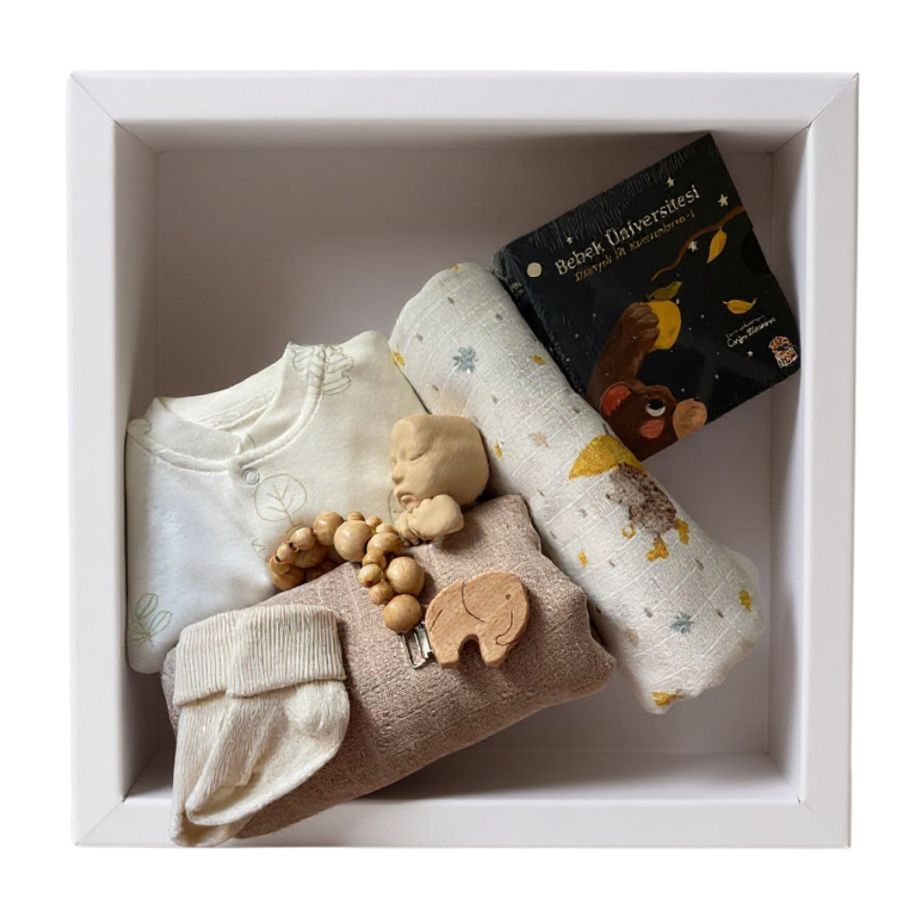 Minik misafirinizi karşılamanın en tatlı yolu! İçindeki özenle seçilmiş parçalarla bu kutu, yeni doğan mutluluğunu paylaşmak için zarif ve anlamlı bir hediye. Beyaz ve sade süslemeli kutu içinde, sizin özel notunuzla…